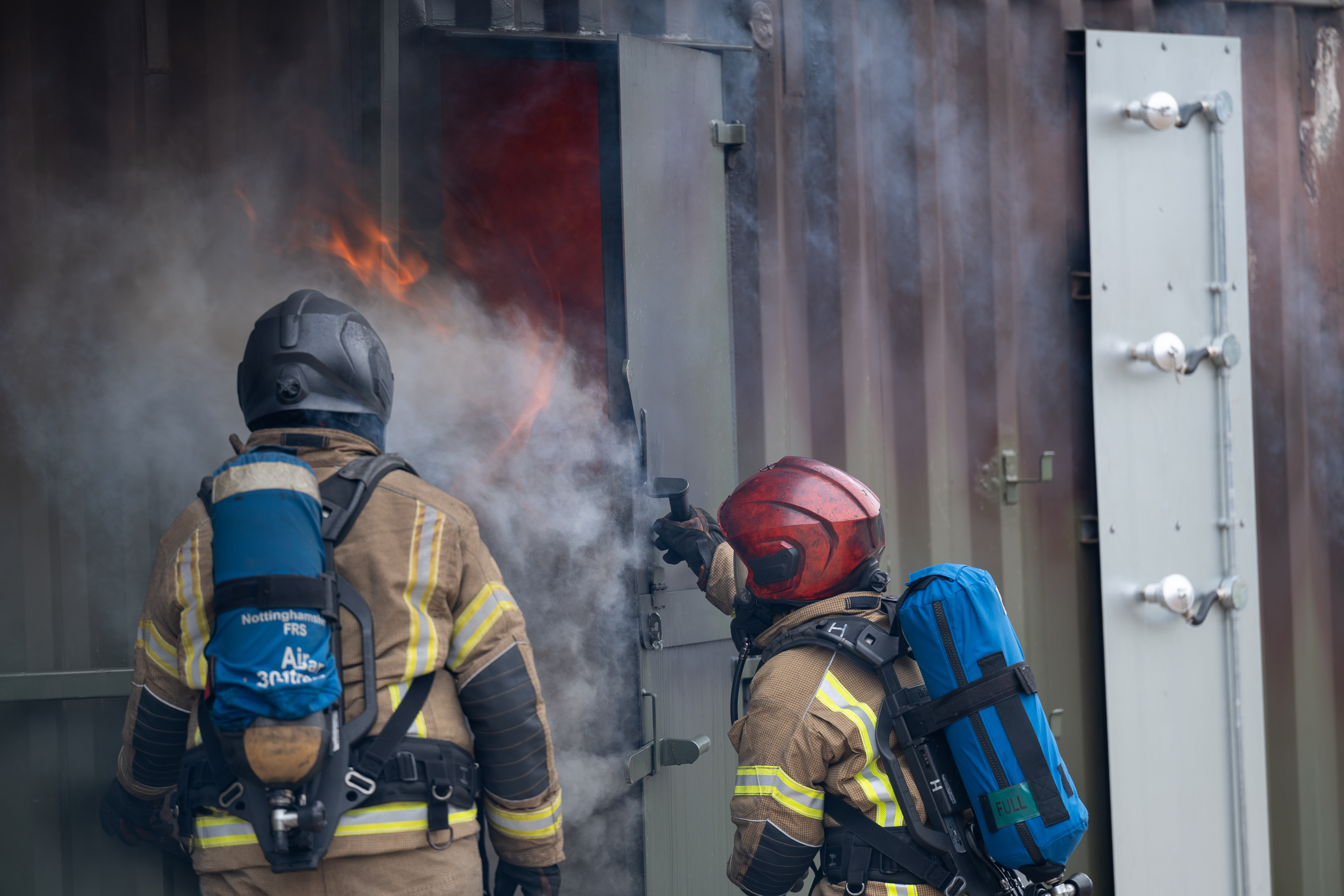 Nottinghamshire Fire and Rescue Service’s new Compartment Fire Behaviour Training (CFBT) unit has reached an important milestone, with firefighters from Carlton and Edinwstowe Fire Stations becoming the first two crews to train in the facility following thorough testing.
